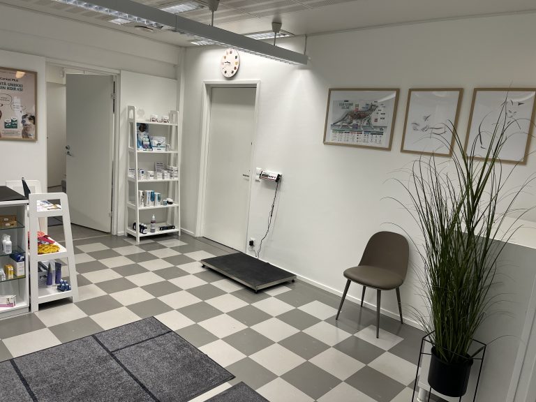Iso odotushuone ja myymälä. Kissoille oma odotusnurkkaus ”kissaparkki”, jossa ne saavat turvallisesti tutkailla tilannetta korkeammalta.