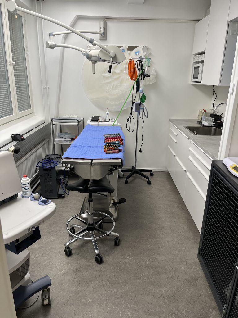 Meillä on klinikalla oma laboratoriolaitteisto, eli virtsanäytteet, verenkuva ja elinarvojen tulokset saadaan heti käynnillä. Leikkaus/-toimenpidehuoneessa onnistuu ennaltasuunniteltu peruskirurgia kuten kastraatiot, pattienpoistot jne. Vatsaontelokirurgiaa ja akuuttikirurgiaa emme turvallisuussyistä tee (työskentelemme ilman hoitajaa).