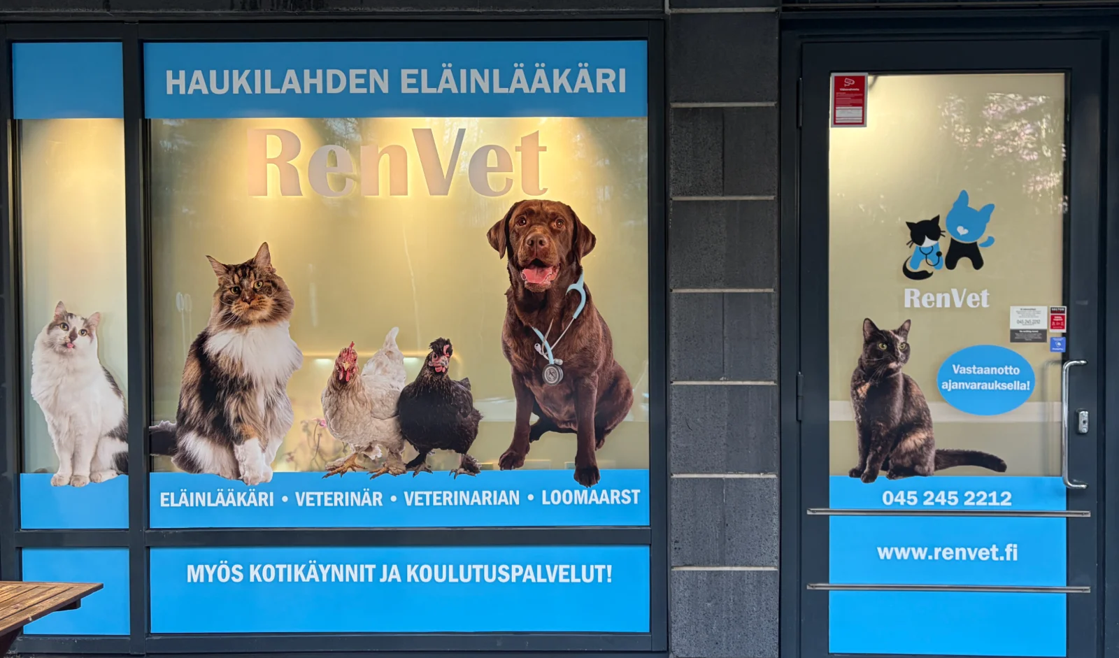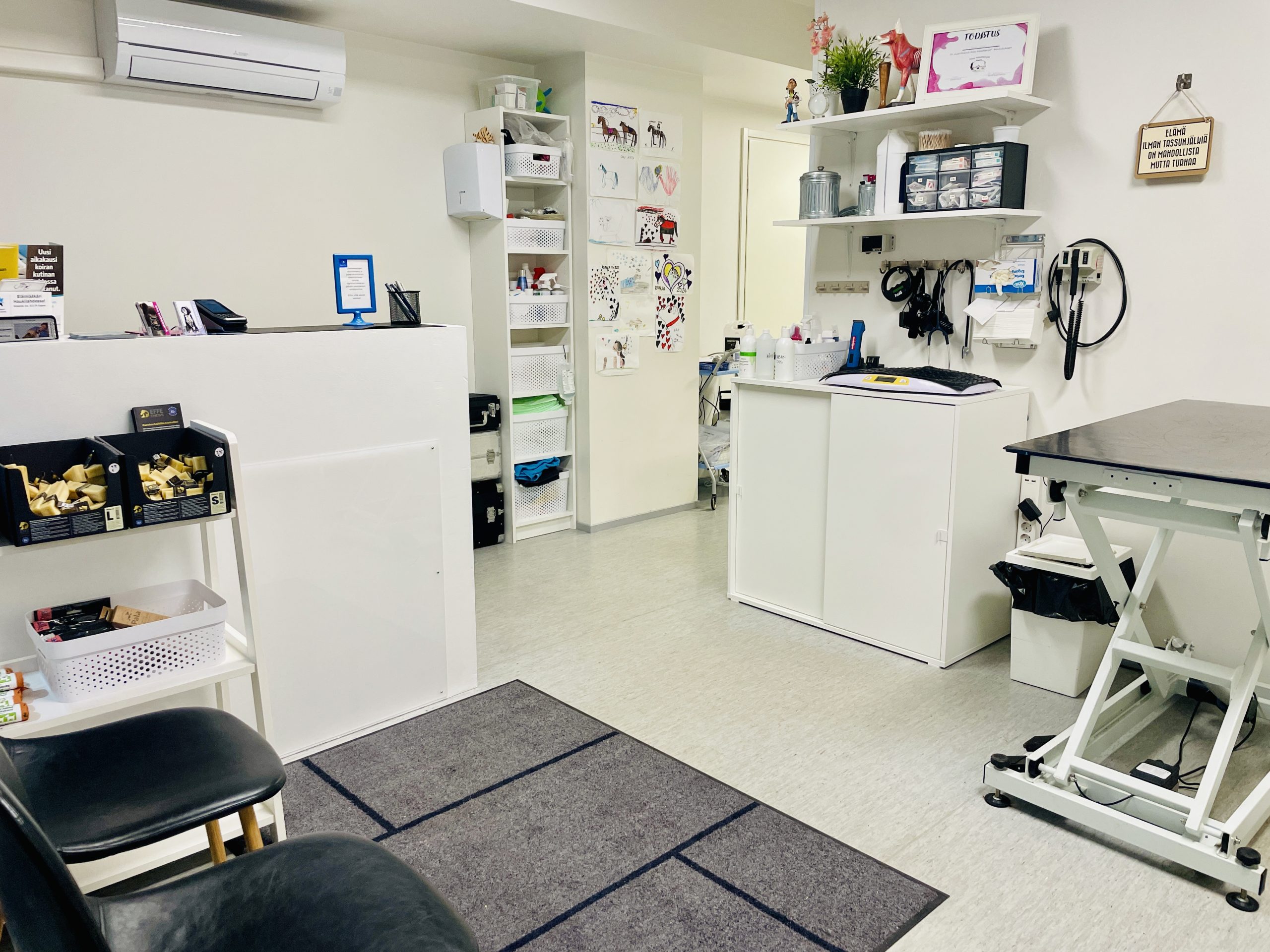 Työskentelemme ilman avustajaa ja käytössämme ovat välineet perustoimenpiteiden suorittamiseksi, pieni laboratorio ja ultraäänilaite. Kiireellistä hoitoa, erityisosaamista ja laajempia tutkimuksia vaativat potilaat ohjaamme ensiavun annettuamme eteenpäin eläinsairaaloihin. Tiloissamme onnistuvat myös pienet kirurgiset toimenpiteet, kuten koirien ja kissojen kastraatiot, haavakirurgia, hammaskiven poisto jne.